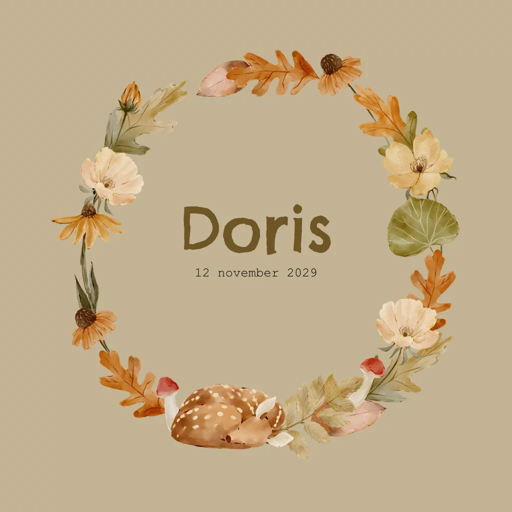 Een herfst geboortekaartje voor de herfstbaby. Met een slapend hertje in een krans van blaadjes en bloemetjes.