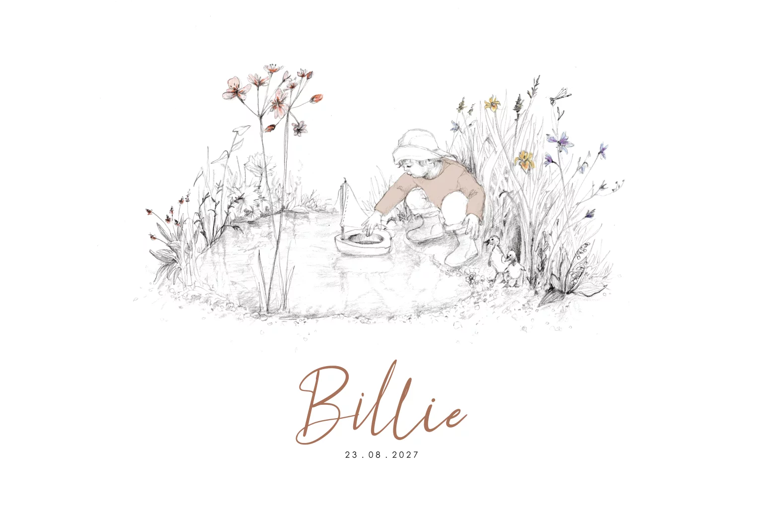 Een lief geboortekaartje met dromerige potlood illustratie van een klein kindje bij een vijvertje. Spelend met een bootje en vergezeld door 2 lieve eendjes die meekijken. Deze fantasie illustratie komt uit de speciale Studio Dijs x Een Allegaartje collectie.