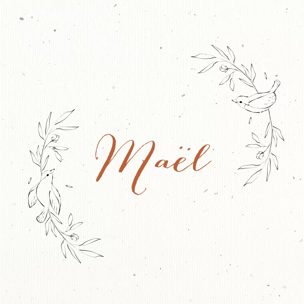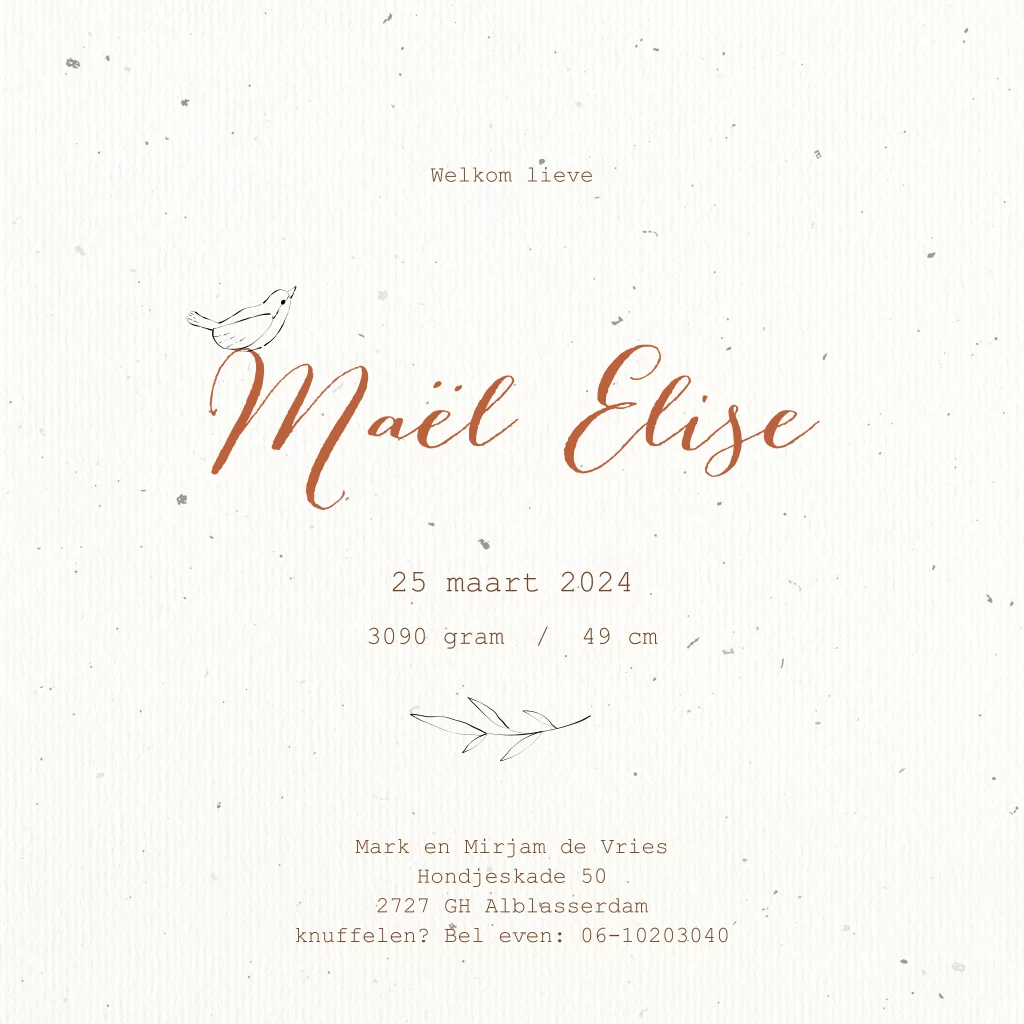 Een vrolijk geboortekaartje lieve vogels tussen de takjes en bladeren. De achtergrond heeft licht zwarte vlekjes voor een extra mooi effect.