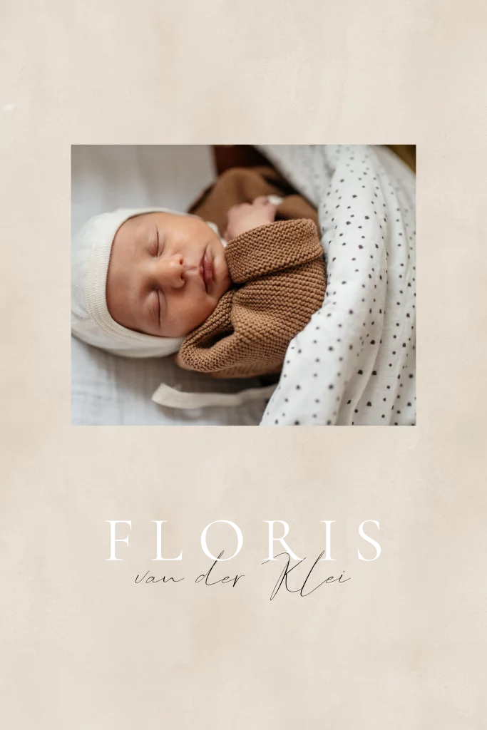 Geboortekaartje met zandkleurige achtergrond en foto op de voorzijde die je makkelijk wijzigt in een eigen foto. De naam op de voorzijde staat in goudfolie.