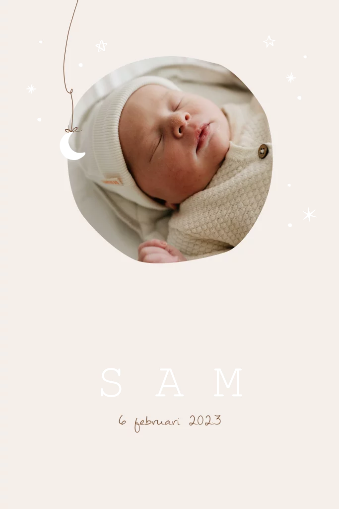 Geboortekaartje zandkleur met foto. De voorzijde is voorzien van goudfolie maan, sterretjes en naam. Upload je eigen foto heel makkelijk op de voorkant en bestel een proefdruk van jouw kaartje!