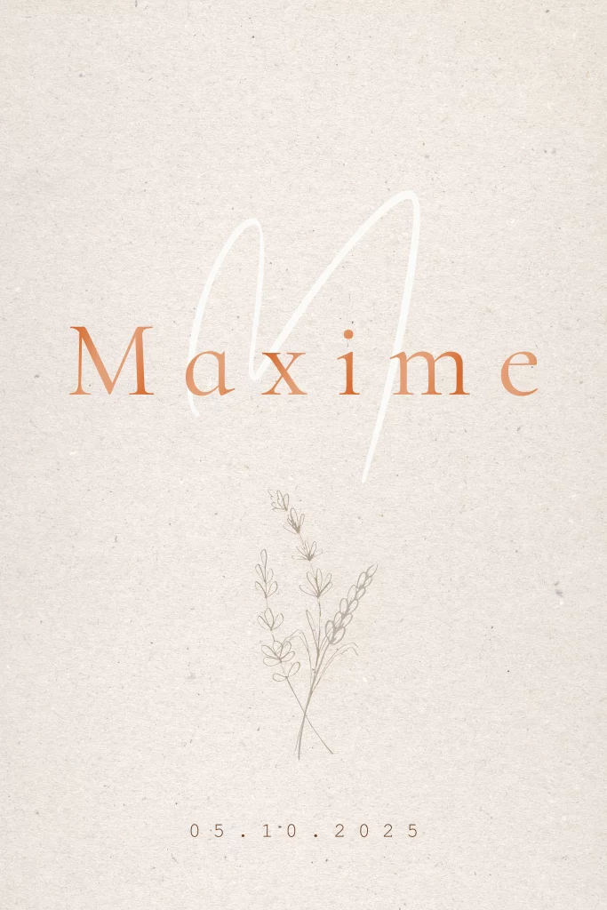 Een minimalistisch geboortekaartje met een zandkleurige achtergrond en subtiele veldbloemen. De voorzijde is voorzien van hoogglans koperlook kleur. Onze tip om deze kaart te drukken op linnen papier.