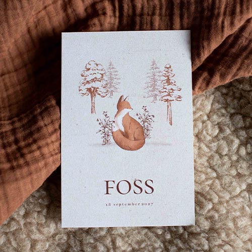 Een lief en stoer geboortekaartje met een vos in de bossen. Een unisex geboortekaartje voor jongens en meisjes.