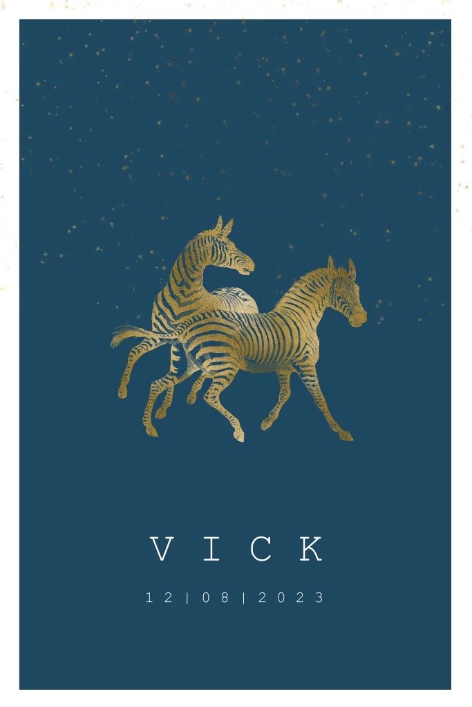 Geboortekaartje met prachtige zebra's in gouden look. Het is dus geen goudfolie, maar heeft wel de gouden charmes!