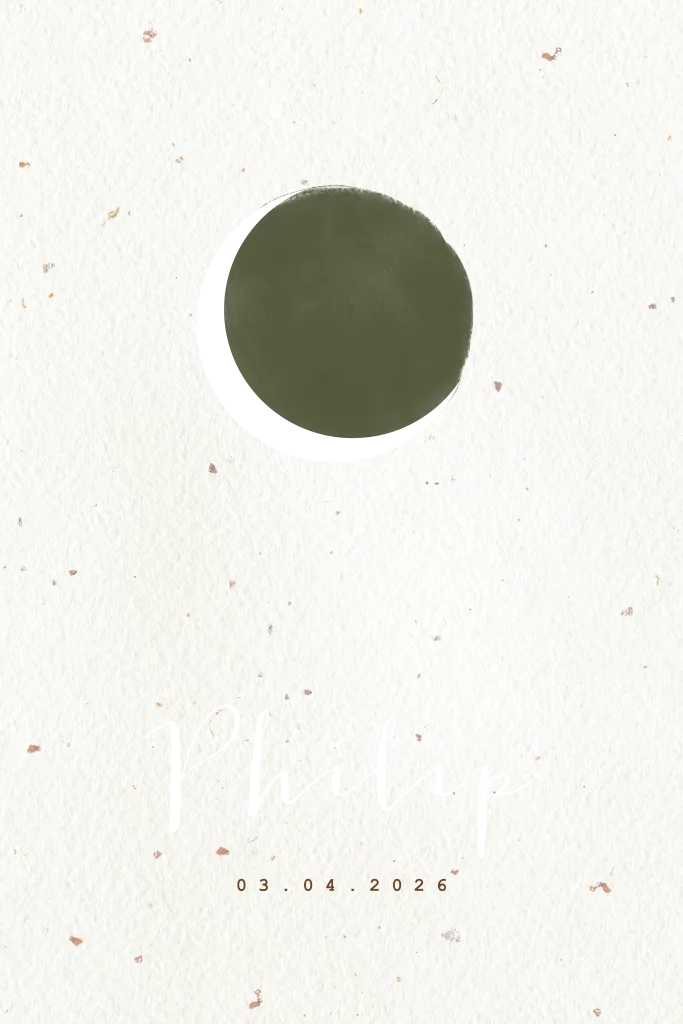 Een uniek geboortekaartje met gevlekte achtergrond groene zon en gouden maan. Bij dit kaartje adviseren we linnen papier.