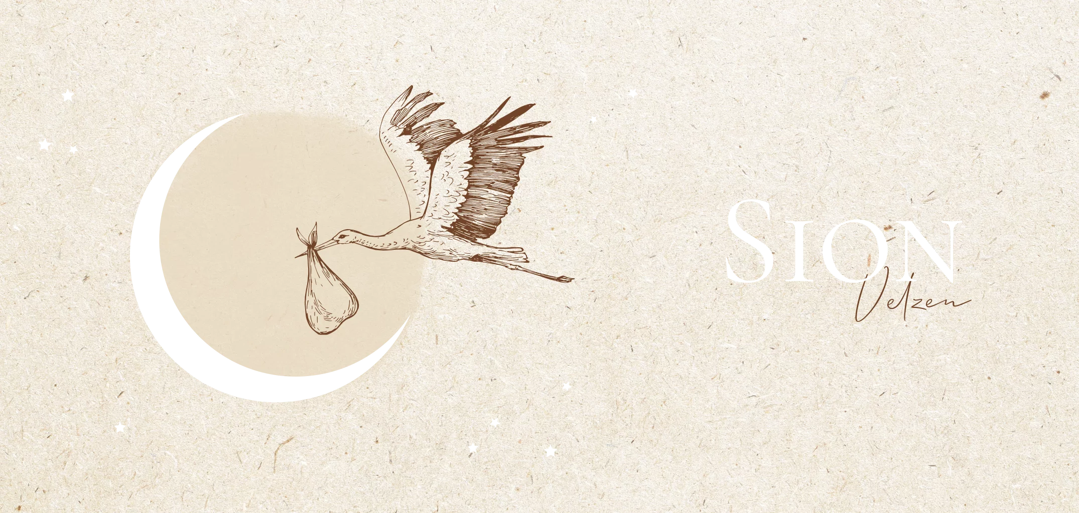 Uniek geboortekaartje met een ooievaar, zon, maan en sterretjes. De maan, sterren en naam staan in goudfolie. De achtergrond heeft een recycle look met vezeltjes. Bij deze kaart adviseren wij linnen papier.