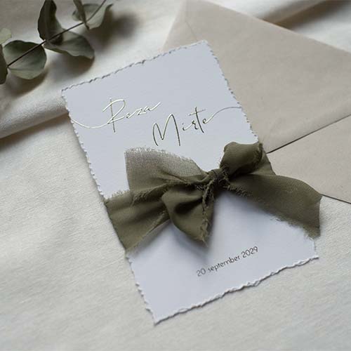 Met onze handgeschepte-look geef je jouw trouwkaart een prachtige, handgemaakte uitstraling. Door zelf de scheurranden te maken met de speciale scheurliniaal, creëer je een bijzonder effect dat jouw kaartje echt uniek maakt. Het scheuren doe je zelf. Om zeker te zijn dat alles vlekkeloos verloopt, raden we aan om 5 extra kaarten te bestellen. Zo heb je altijd genoeg kaarten.
