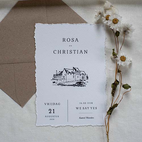 Met onze handgeschepte-look geef je jouw trouwkaart een prachtige, handgemaakte uitstraling. Door zelf de scheurranden te maken met de speciale scheurliniaal, creëer je een bijzonder effect dat jouw kaartje echt uniek maakt. De scheurliniaal kun je erbij bestellen in het bestelproces. Let op: het scheuren doe je zelf. Om zeker te zijn dat alles vlekkeloos verloopt, raden we aan om 5 extra kaarten te bestellen. Zo heb je altijd genoeg kaarten.