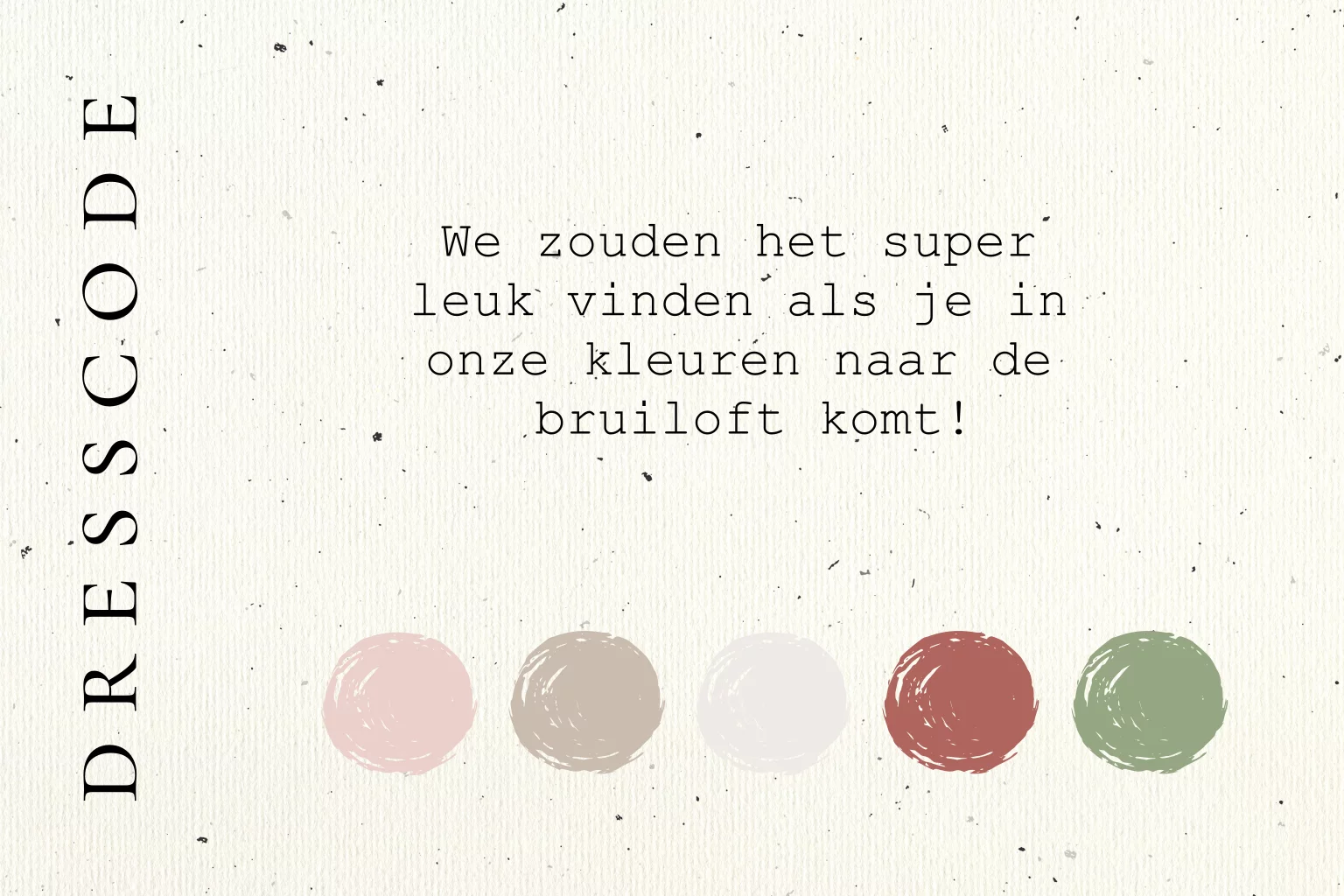 Vertel jouw gasten de dresscode op jullie bruiloft via dit kaartje. Pas de kleuren eenvoudig aan in de online editor. Voeg het toe aan de trouwkaart en laat je gasten in stijl arriveren op jullie grote dag!