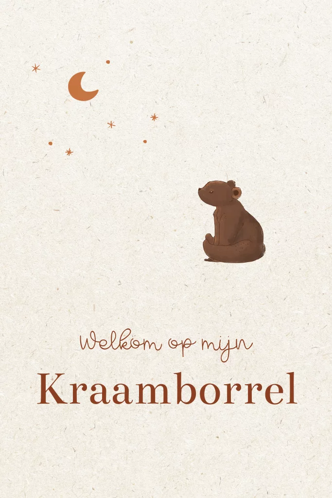 Een minimalistisch kraamborrel kaartje met ecolook achtergrond. Een lief beertje, kijkend naar de maan en sterren.