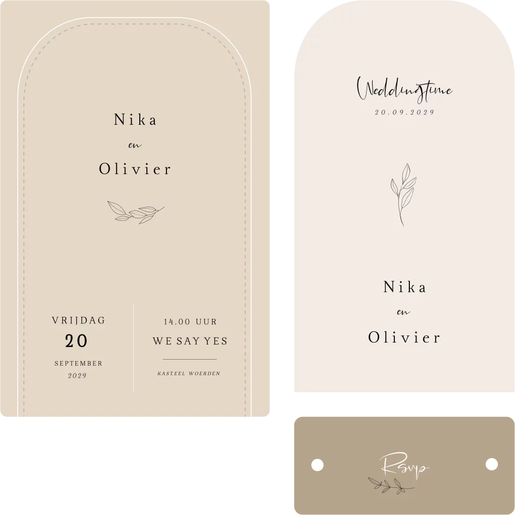 Klassieke trouwkaart in naturel tinten: wit, beige, zand en taupe. Een populaire kleurencombinatie die stijlvol is en nooit verveelt. De trouwkaart set bestaat uit een trouwkaart, programmakaart en klein RSVP kaartje.