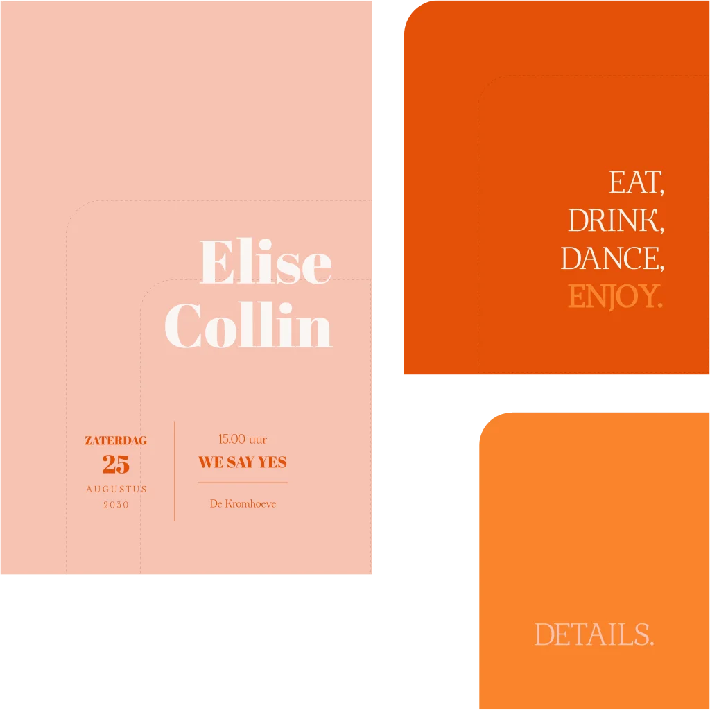 De uitnodiging bevat de belangrijkste gegevens van jullie trouwdag. Op de dagplanning kaart geef je het programma weer en de detailkaart is geschikt voor aanvullende informatie zoals RSVP, dresscode of locatie.