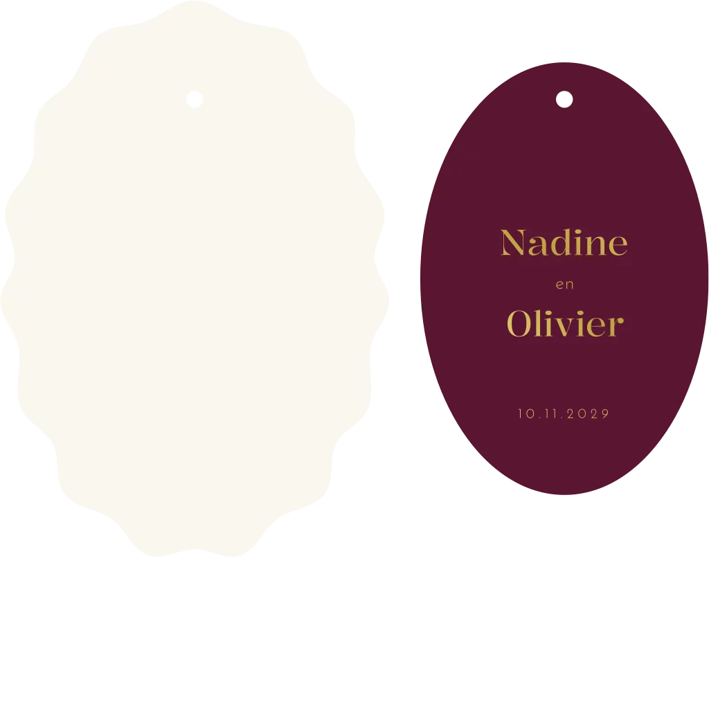 Trouwkaartenset bestaande uit een trouwkaart en dagplanning. Deze set van 2 ovale kaarten hebben beige en aubergine paarse kleuren en passen zowel bij een romantische bruiloft als een herfst en winter bruiloft. Het stippellijntje op de grote kaart wordt niet mee gedrukt maar toont enkel waar de kleine kaart komt.