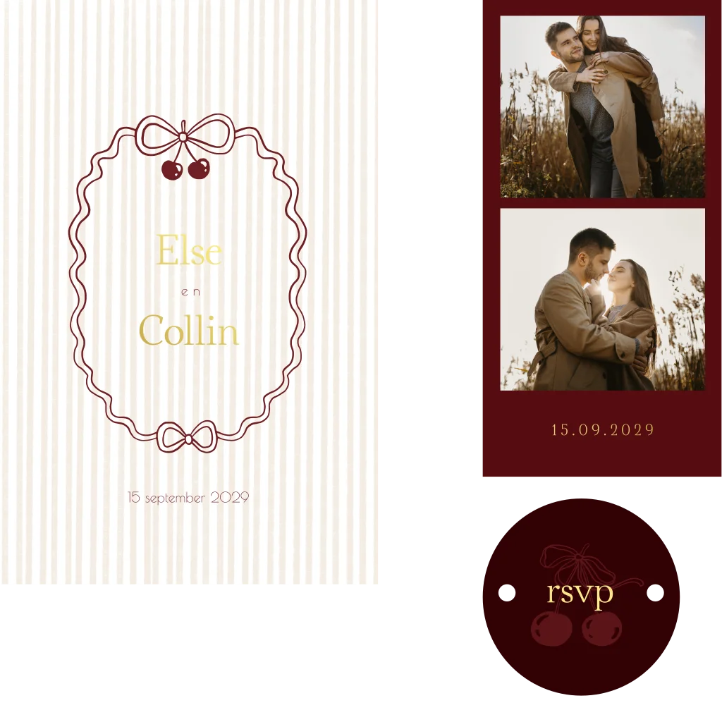 Trouwkaarten set bestaande uit een trouwkaart, dagplanning met foto's aan de voorzijde en een klein labeltje wat kan dienen voor kleine details, zoals een RSVP. Deze trendy trouwkaartenset heeft warme aubergine paars / roze kleuren en hippe kersjes en strikjes als romantisch detail. De voorzijde is voorzien van goudfolie elementen.