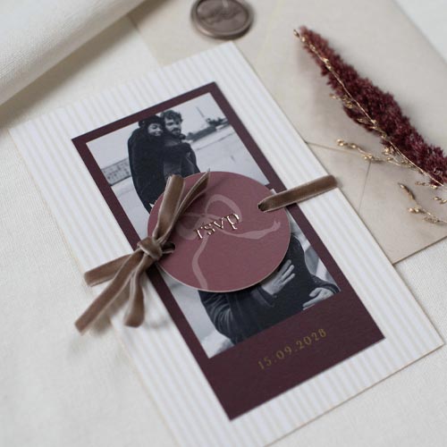 Trouwkaarten set bestaande uit een trouwkaart, dagplanning met foto's aan de voorzijde en een klein labeltje wat kan dienen voor kleine details, zoals een RSVP. Deze trendy trouwkaartenset heeft warme aubergine paars / roze kleuren en hippe strikjes als romantisch detail. De voorzijde is voorzien van goudfolie elementen.