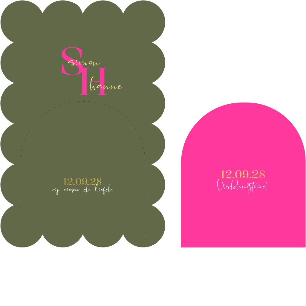 Deze trouwkaart set bestaat uit een trouwkaart en extra kaartje voor de diverse soorten bruiloftsgasten. Gebruik dit extra kaartje voor persoonlijke informatie. De set bestaat uit vrolijke en felle kleuren groen en roze, gecombineerd met goudfolie. Pas de kleuren eenvoudig aan in de online ontwerptool.