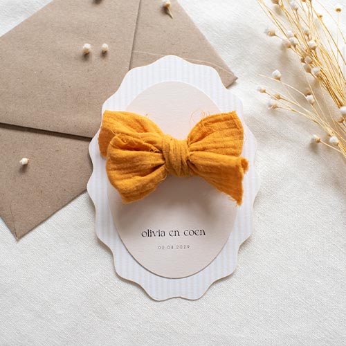 Trouwkaartenset bestaande uit een trouwkaart en een ovale voorzijde om een mooi lint doorheen te doen. Let op: dit lint is een voorbeeld en zit er niet bij. Deze set van 2 ovale kaarten hebben beige en witte kleuren. Dit past bij zowel bij een romantische bruiloft als een moderne bruiloft. Het stippellijntje op de grote kaart wordt niet mee gedrukt maar toont enkel waar de voorste kaart komt.