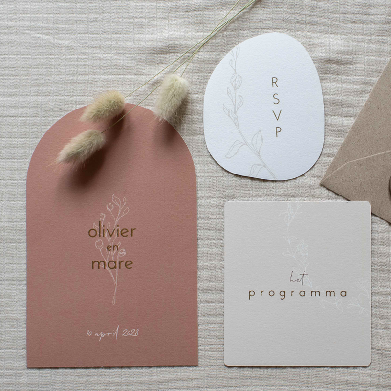 Stijlvolle trouwkaartenset bestaande uit een trouwkaart, programmakaart en een klein detail kaartje met RSVP en eventuele andere details. Deze set van 3 kaarten bestaat uit naturel en aardetinten; wit, zand en terracotta in combinatie met goudfolie. De set past goed bij zowel een minimalistische bruiloft als romantische bruiloft.