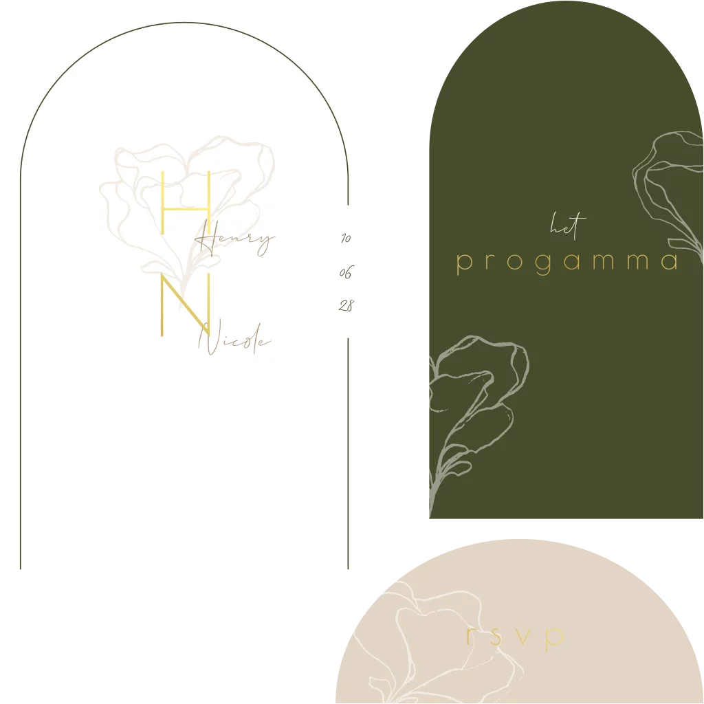 Trouwkaarten set bestaande uit een trouwkaart, programma kaart en een rsvp. Een warme combinatie van de kleuren wit, zand en olijfgroen. In combinatie met gouden accenten.