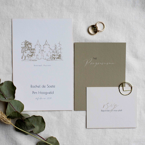 Trouwkaartenset bestaande uit een trouwkaart, programmakaart en een klein detail kaartje met RSVP en dieetwensen. Deze set van 3 rechthoekige kaarten hebben rustige, naturel en aardetinten en passen zowel bij een moderne bruiloft als een romantische bruiloft.