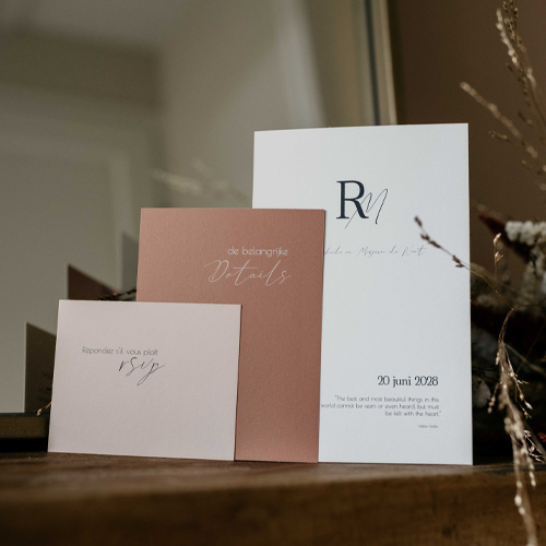 Trouwkaartenset bestaande uit een trouwkaart, programmakaart en een klein detail kaartje met RSVP en dieetwensen. Deze set van 3 rechthoekige kaarten hebben rustige aardetinten; beige, oudroze en terracotta. De trouwkaart is voorzien van initialen in de vorm van een trouwlogo. De set past bij zowel een moderne bruiloft als een minimalistische bruiloft.