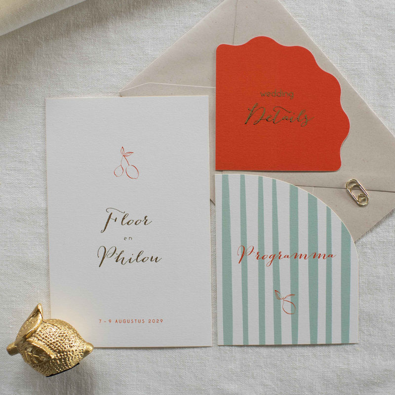 Vrolijke en zomerse trouwkaarten set met oranje en groene kleuren in combinatie met goudfolie details. Het kleinste kaartje heeft een schulprand. de set bestaat uit een trouwkaart, programma kaart en een klein detail kaartje. Bijvoorbeeld voor de RSVP of dieetwensen.