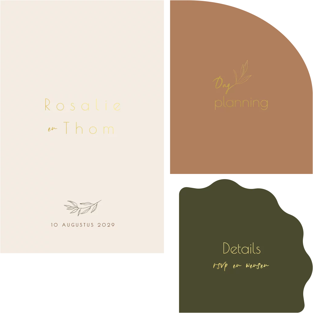 Stijlvolle trouwkaarten set bestaande uit de kleuren: zand, olijfgroen en brons bruin met goudfolie details. Het kleinste kaartje heeft een schulprand. De set bestaat uit een trouwkaart, programma kaart en een klein detail kaartje. Bijvoorbeeld voor de RSVP of dieetwensen.