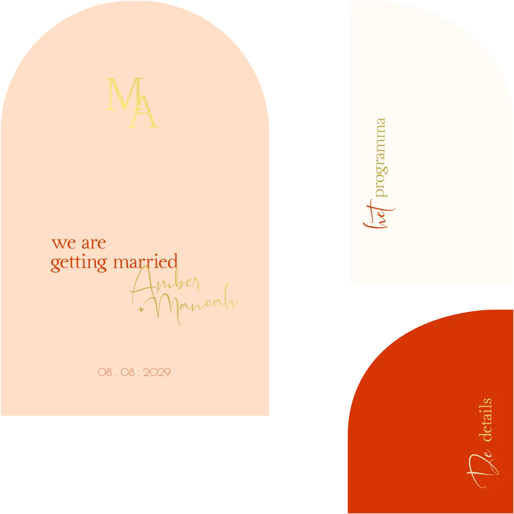 Vrolijke trouwkaartenset bestaande uit een trouwkaart, programmakaart en een klein detail kaartje met RSVP en dieetwensen. Deze set van 3 kaarten hebben vrolijke kleuren; wit, perzik en oranje in combinatie met goudfolie. De set past goed bij zowel een moderne bruiloft, zomerse bruiloft of een bruiloft in het buitenland.