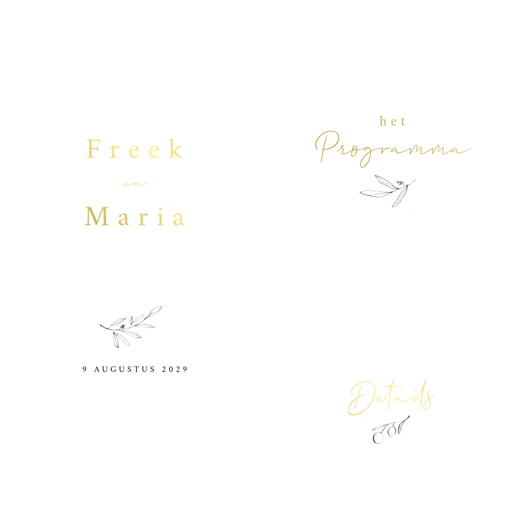 Trouwkaarten set met een trouwkaart, dagprogramma en detail kaartje. Deze kaart in minimalistische vorm heeft subtiele olijftakjes en goudfolie voor een mooi effect.