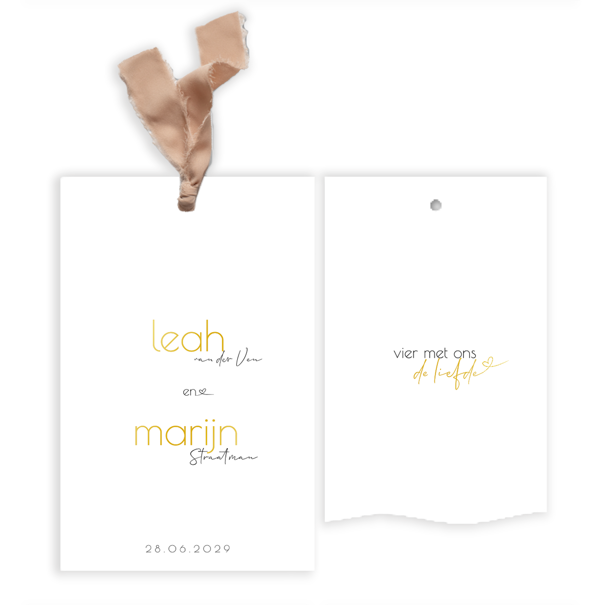 Trouwkaartenset bestaande uit 2 kaarten, waarvan de trouwkaart en een dagplanning. Witte kaarten met zwart en goudfolie tekst en een klein hartje als subtiel en romantisch detail. De kaarten zijn voorzien van een stansgaatje om het lint doorheen te doen en de kaarten aan elkaar vast te maken als een label set.