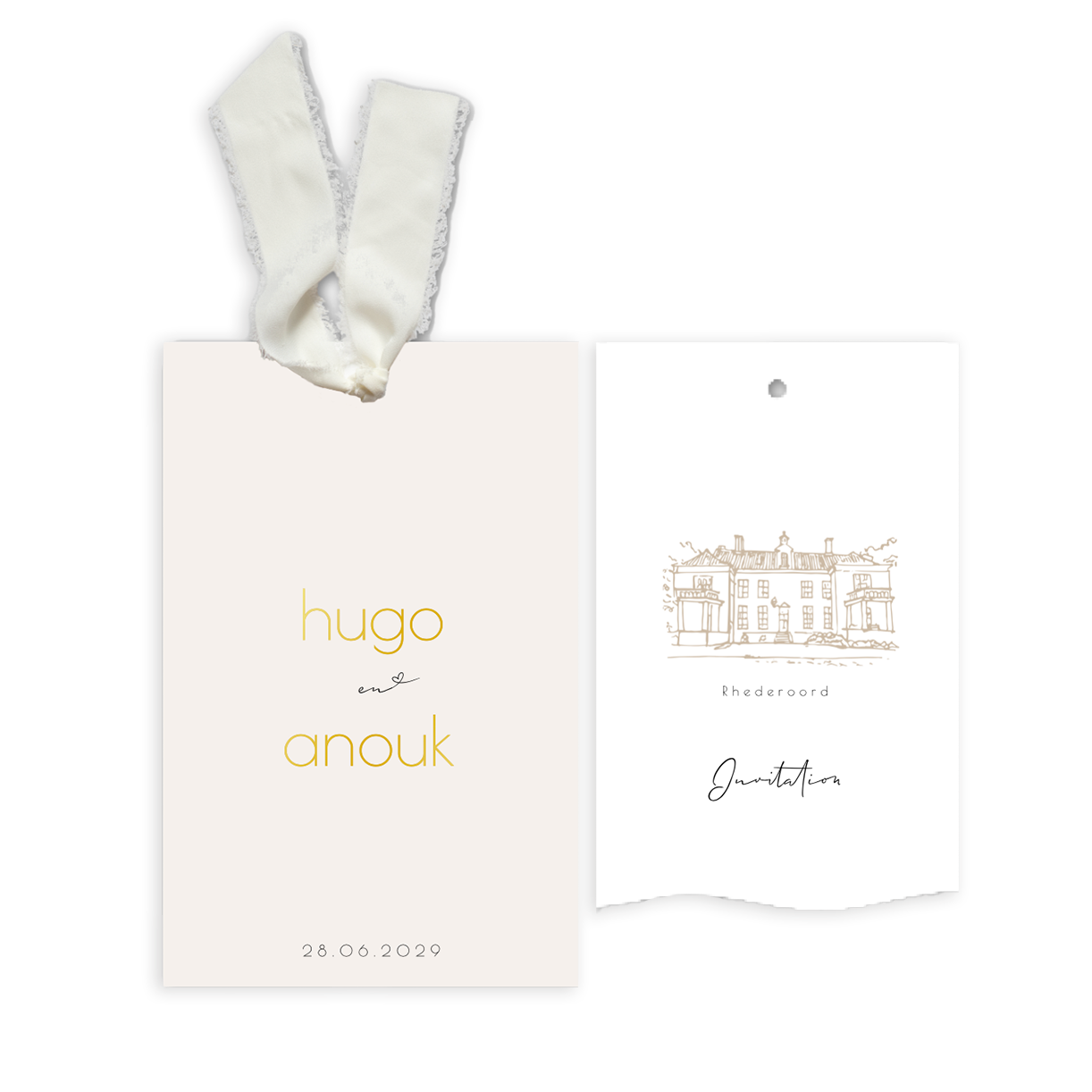 Trouwkaartenset bestaande uit 2 kaarten, waarvan de trouwkaart en een dagplanning. In naturel: wit en beige. Met goudfolie namen en een trouwlocatie in lijntekening. De kaarten zijn voorzien van een stansgaatje om het lint doorheen te doen en de kaarten aan elkaar vast te maken als een label set.