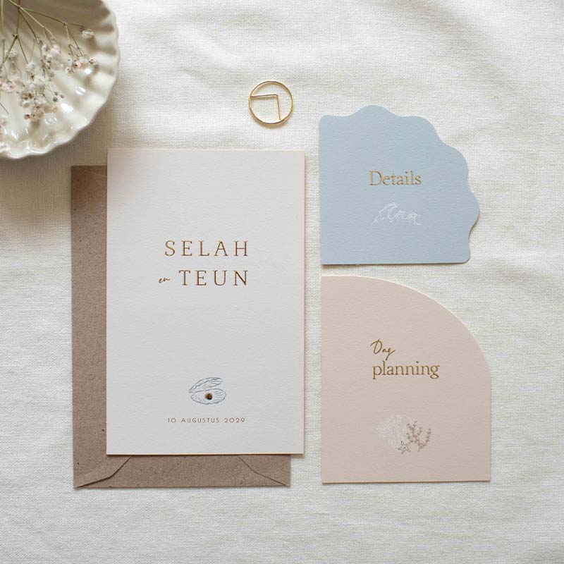 Trouwkaarten voor een echte beach wedding. Met de kleuren: beige, zand, blauw en goudfolie details. De kaarten hebben echte strand icoontjes zoals schelpen, golven en een parasol. Het kleinste kaartje heeft een schulprand. De set bestaat uit een trouwkaart, programma kaart en een klein detail kaartje. Bijvoorbeeld voor de RSVP of dieetwensen.