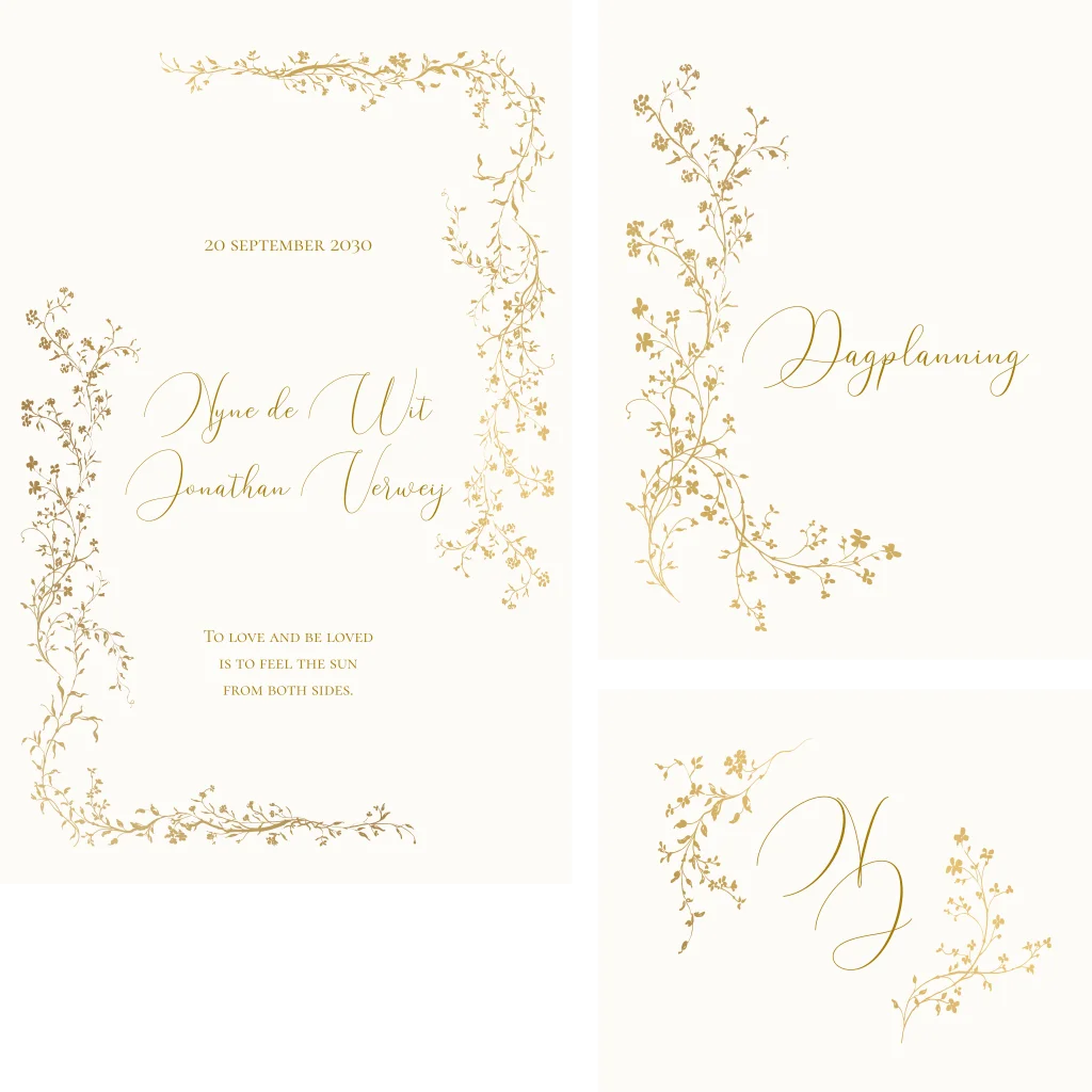Deze elegante trouwkaartenset met goudfolie bestaat uit een trouwkaart, een dagplanning kaart en een klein detailkaartje. De set valt op door de fijne botanische takjes, sierlijke bloemen en stijlvolle typografie. De combinatie van een zachte lichte achtergrond en goudfolie geeft deze trouwkaarten set een rustige, luxe en romantische uitstraling. Een mooi ontwerp voor wie houdt van botanische trouwkaarten, stijlvolle details en een tijdloze look op de trouwdag.