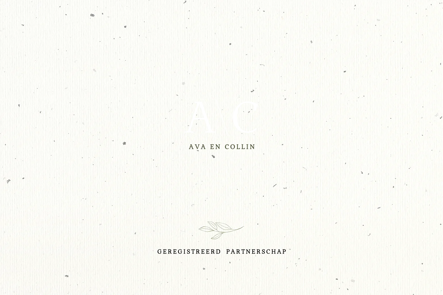 Minimalistische en hippe kaart voor geregistreerd partnerschap met de initialen in een gouden logo. De achtergrond van de kaart heeft lichte vlekjes voor een origineel effect en een eco look.