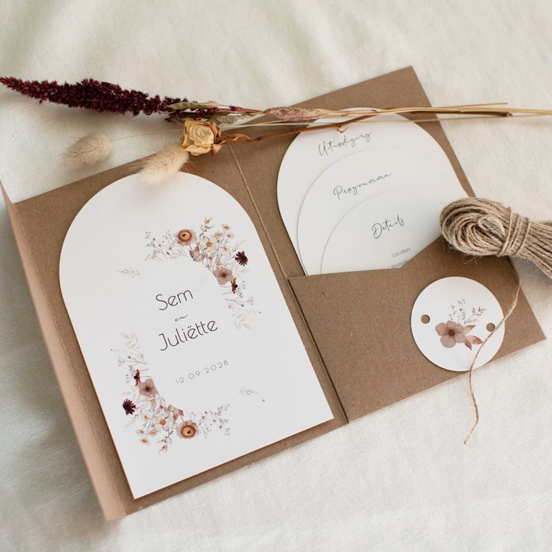 Pocketfold set bruiloft trouwkaarten met romantische bloemen in aardetinten. De pocketfold set bestaat uit een kaart die je vastmaakt aan de linkerzijde met een paperclip of met lijm. Deze kaart bedruk je meestal niet aan de achterkant omdat je deze laat zitten. In het gleufje komen de trouwkaart met de uitnodigende tekst, de dagplanning en een klein kaartje met details, zoals RSVP, adressen en dieetwensen. De achterzijde van de kaarten zijn ook allemaal te bedrukken met informatie. Met deze pocketfold set kun je alle informatie van de bruiloft op een mooie en overzichtelijke manier kwijt!