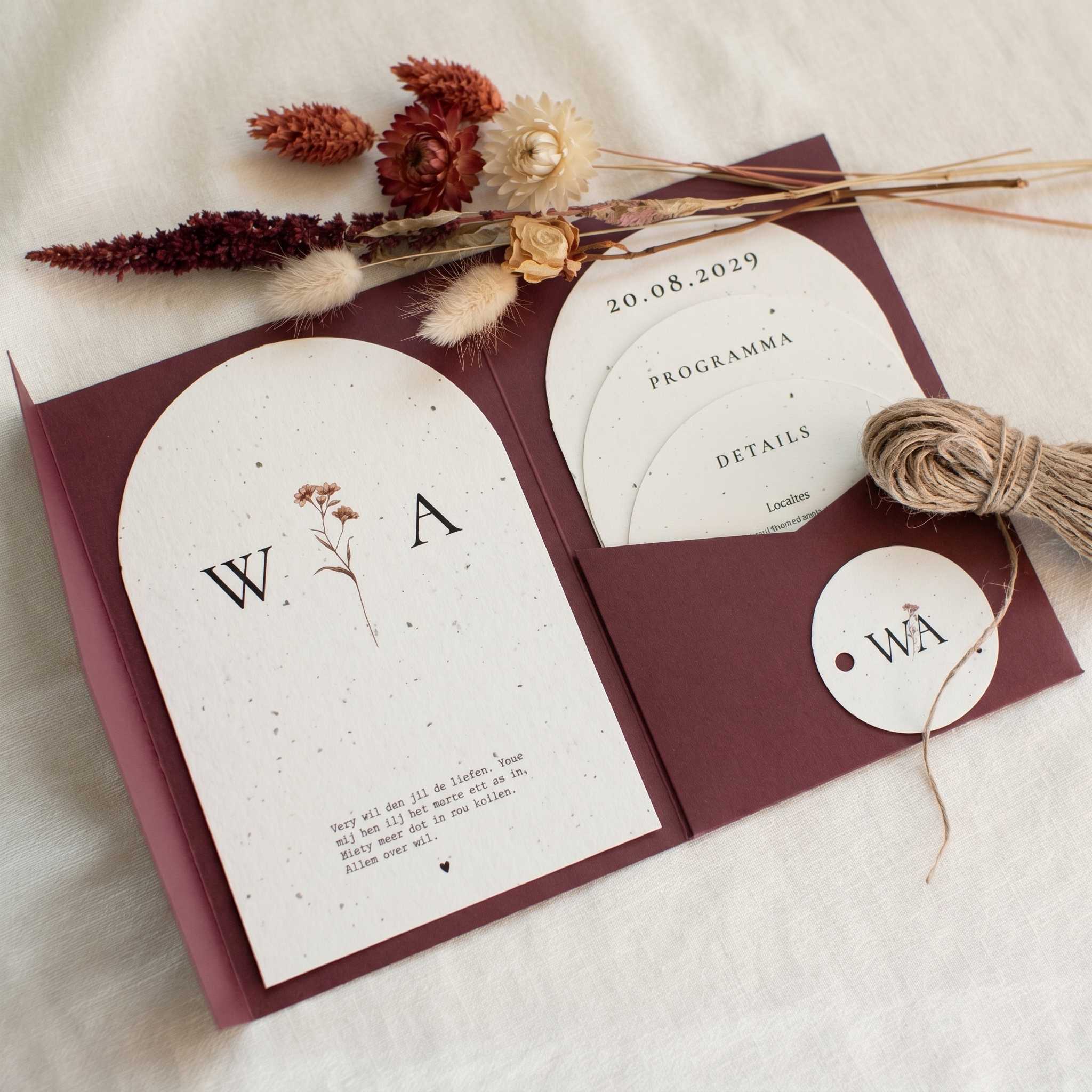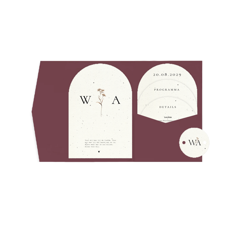 Maak de linker kaart vast met een bijpassende paperclip. Maak het ronde labeltje vast aan de pocketfold met bijpassend touw of lint. Doe de pocketfold kaarten in de speciale pocketfold mapjes. Deze producten worden niet standaard meegeleverd en kun je los bestellen in de webshop of aanvinken in het bestelproces.