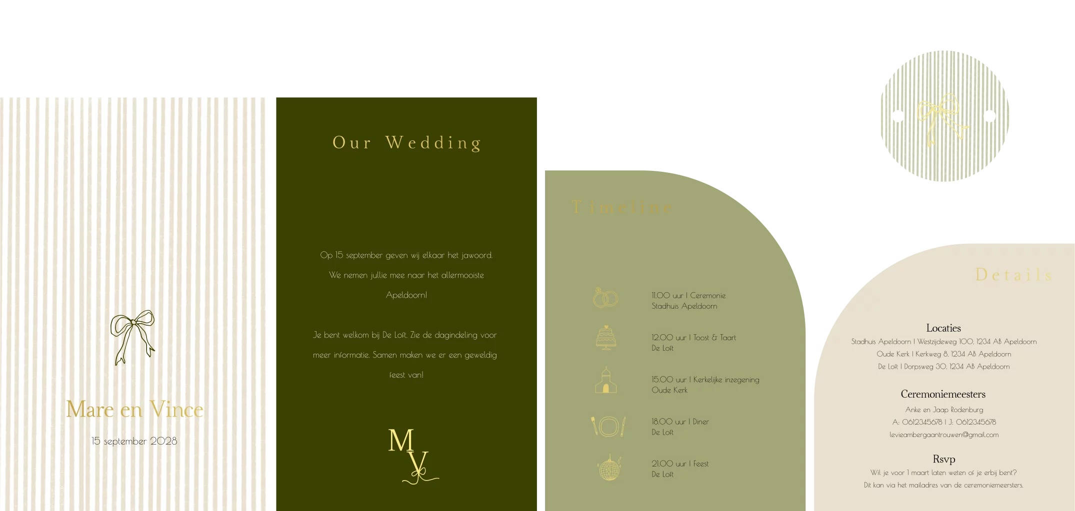 Romantische pocketfold trouwkaartenset. In de warme kleuren groen, zand en goudfolie. Met strikjes als sierlijk detail. De pocketfold set bestaat uit een kaart die je vastmaakt aan de linkerzijde met een paperclip of met lijm. Deze kaart bedruk je meestal niet aan de achterkant omdat je deze laat zitten. In het gleufje komen de trouwkaart met de uitnodigende tekst, de dagplanning en een klein kaartje met details, zoals RSVP, adressen en dieetwensen. De achterzijde van de kaarten zijn ook allemaal te bedrukken met informatie. Met deze pocketfold set kun je alle informatie van de bruiloft op een mooie en overzichtelijke manier kwijt!