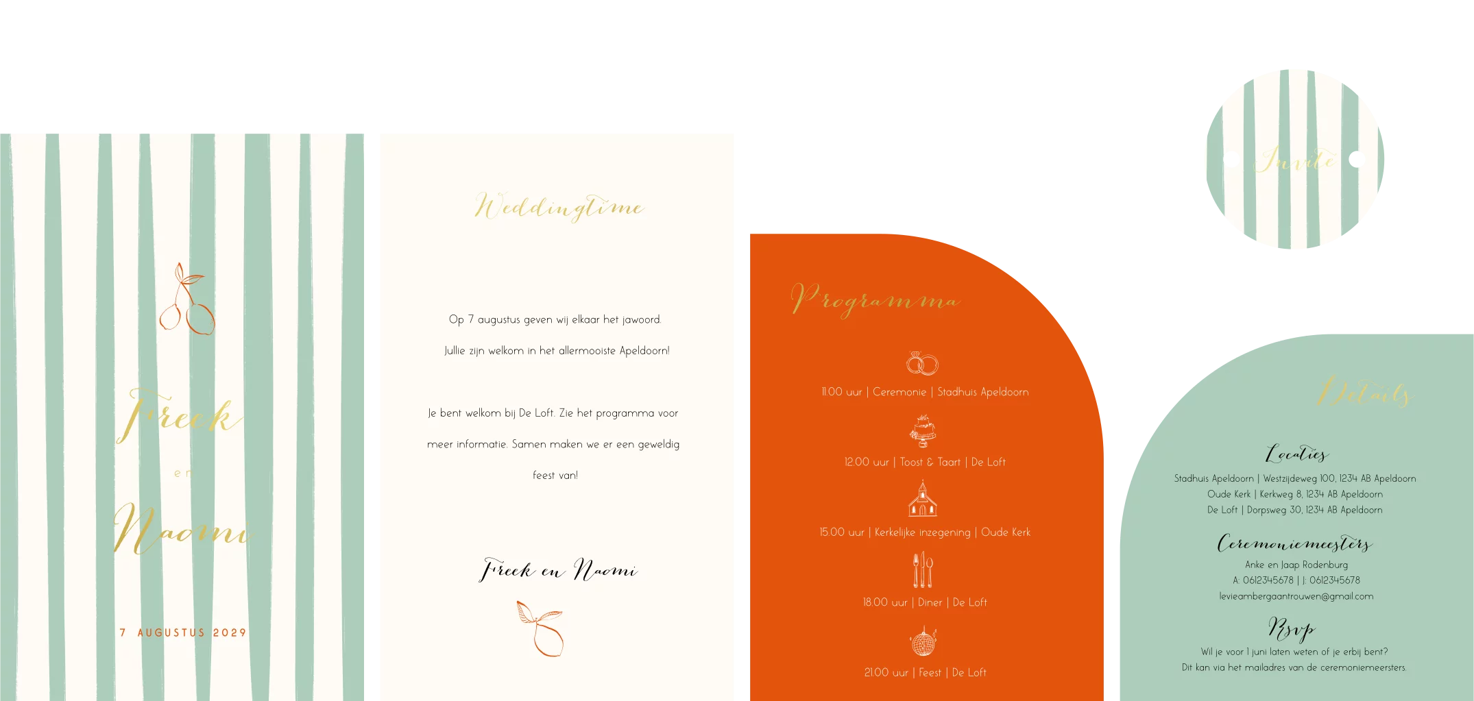 Pocketfold trouwkaart set met een zomers ontwerp van vrolijke kleuren groen en oranje in combinatie met lijntekening citroenen en goudfolie tekst. De pocketfold set bestaat uit een kaart die je vastmaakt aan de linkerzijde met een paperclip of met lijm. Deze kaart bedruk je meestal niet aan de achterkant omdat je deze laat zitten. In het gleufje komen de trouwkaart met de uitnodigende tekst, de dagplanning en een klein kaartje met details, zoals RSVP, adressen en dieetwensen. De achterzijde van de kaarten zijn ook allemaal te bedrukken met informatie. Met deze pocketfold set kun je alle informatie van de bruiloft op een mooie en overzichtelijke manier kwijt!