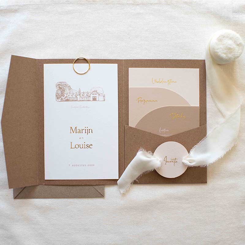 Pocketfold trouwkaart set met neutrale kleuren: wit, beige, zand en bruin. De voorzijde van de trouwkaart heeft een illustratie van trouwlocatie Landgoed Brakkesteyn. Bij de afbeeldingen in de ontwerptool vind je nog veel meer trouwlocaties. Staat jouw locatie er niet tussen? Mail ons! De pocketfold set bestaat uit een kaart die je vastmaakt aan de linkerzijde met een paperclip of met lijm. Deze kaart bedruk je meestal niet aan de achterkant omdat je deze laat zitten. In het gleufje komen de trouwkaart met de uitnodigende tekst, de dagplanning en een klein kaartje met details, zoals RSVP, adressen en dieetwensen. De achterzijde van de kaarten zijn ook allemaal te bedrukken met informatie. Met deze pocketfold set kun je alle informatie van de bruiloft op een mooie en overzichtelijke manier kwijt!