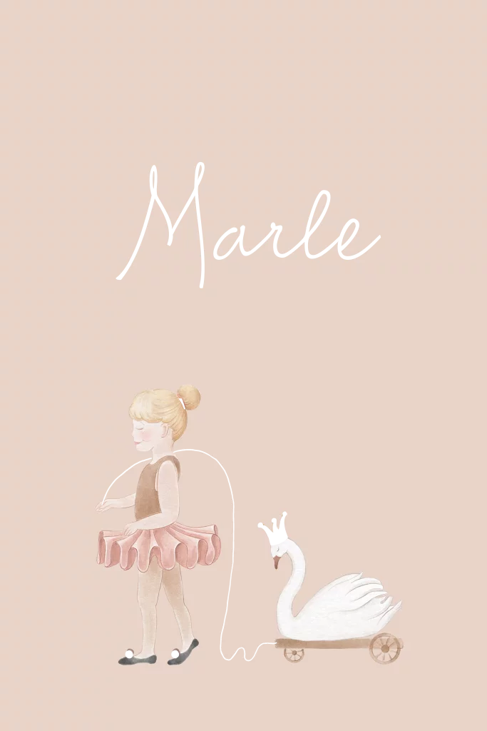 Poster voor de babykamer met een kleine ballerina die een zwaantje op een wagonnetje achter haar aan trekt. Verschillende elementen zijn gedrukt in goudfolie.