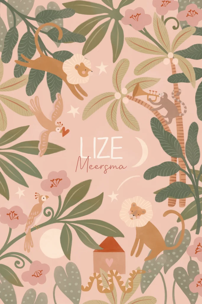 Poster op basis van het geboortekaartje. Een ontwerp in zachte roze tinten met vrolijke illustraties van jungledieren, zoals een aap en leeuw. Onderdeel van onze collectie Studio Dijs x Froukje. Je past het ontwerp eenvoudig aan in onze online ontwerptool. Hulp nodig? Mail ons gerust, we helpen je graag.