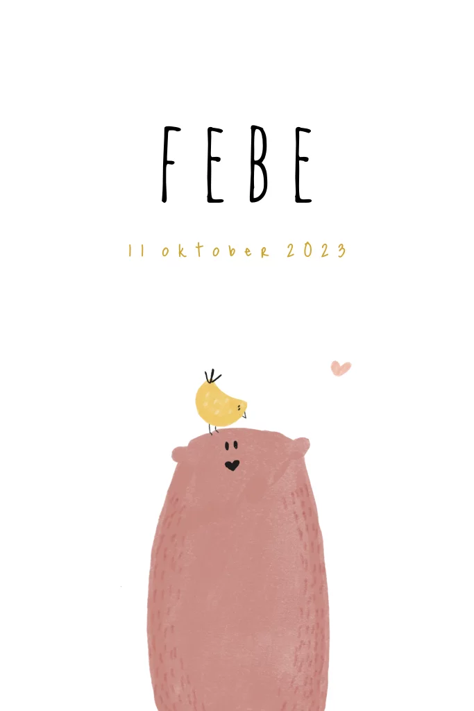 Grappige poster met een roze beer en een geel vogeltje op z'n hoofd.