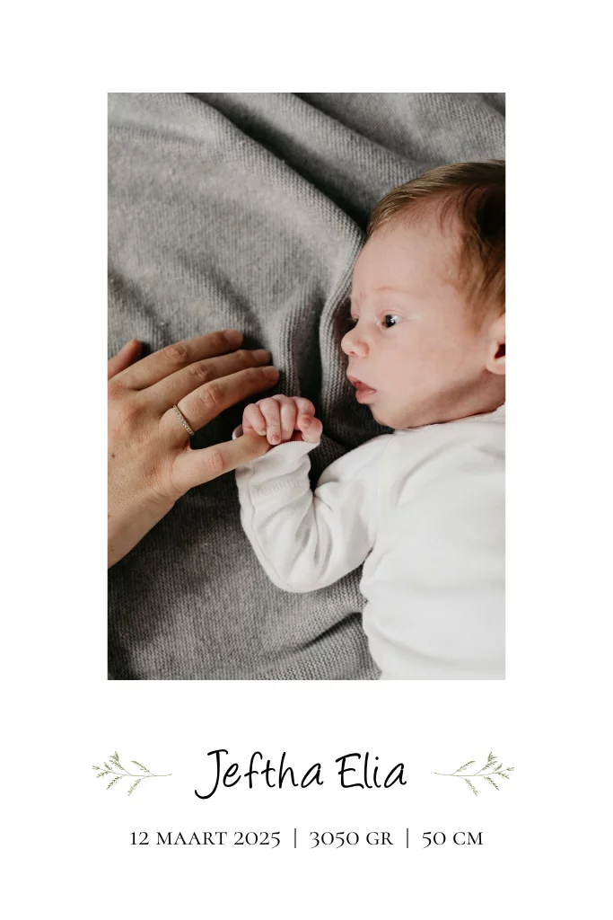 - Marloes“Ruime keuze uit geboortekaartjes die passen bij het seizoen, heel fijn dat je ze zelf kan aanpassen naar smaak. We hadden alles klaar staan en hoefde alleen nog geboorteinfo aan te passen. Daardoor waren de kaartjes al op dag 3 na de geboorte in huis! Superfijn.”