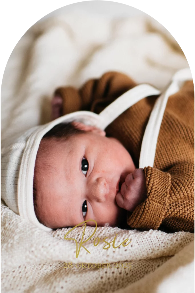 Geboortekaartje in de unieke vorm van een poort. De foto's vervang je eenvoudig voor je eigen foto's. Met goudfolie op de voorzijde.