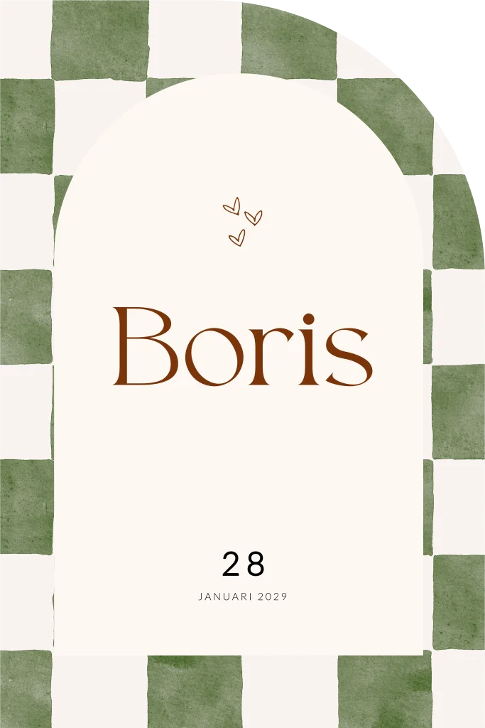 Geblokt geboortekaartje voor een jongen in warme, winterse kleuren olijfgroen en warm bruin. De kaart heeft een originele vorm voor een extra unieke look!