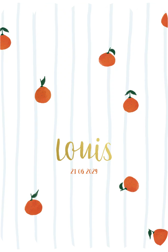 Geboortekaartje voor een jongen met kartelrand en lichtblauw streep patroon. Met vrolijke sinaasappels.