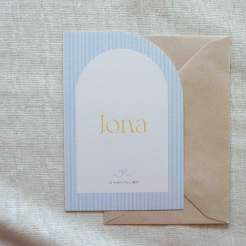 Hip geboortekaartje voor een jongen. De kleuren lichtgeel en lichtblauw geven dit geboortekaartje een lieve en zomerse uitstraling.