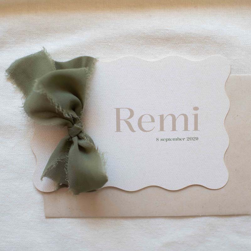 Lief en neutraal geboortekaartje voor een jongen strik van groen lint. De achtergrond heeft een linnen look structuur.