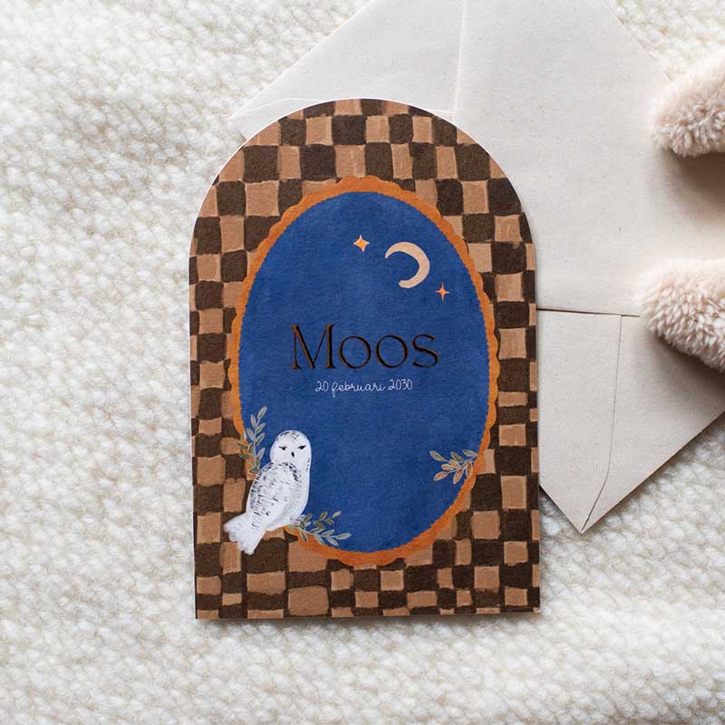 Lief, hip geboortekaartje voor een jongen. In Boho Eclectische stijl met verschillende kleuren en vormen. Met een witte uil op de voorzijde tussen de maan en sterren. De naam op de voorzijde staat in goudfolie.