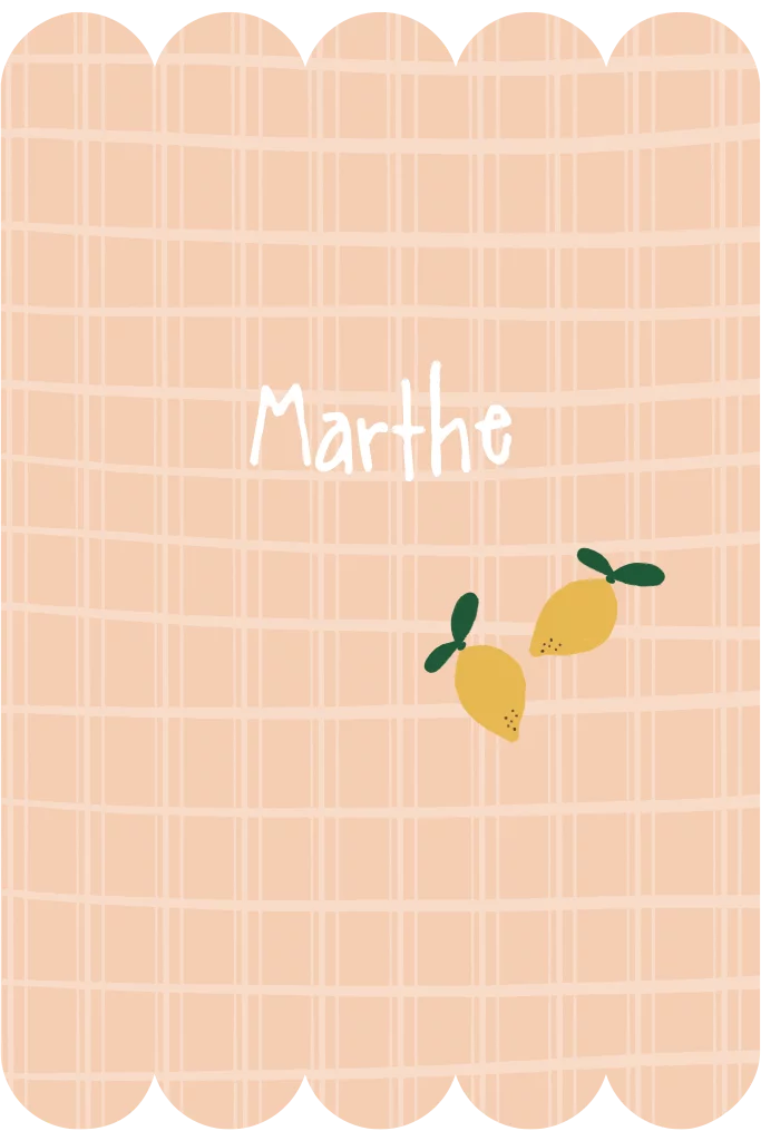 Geboortekaartje voor een meisje met kartelrand en zalmroze ruitjes patroon. Met speelse, gele citroenen.